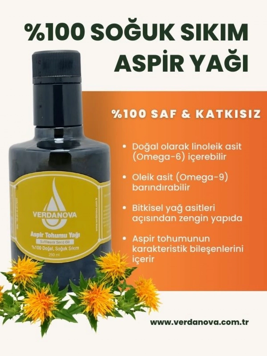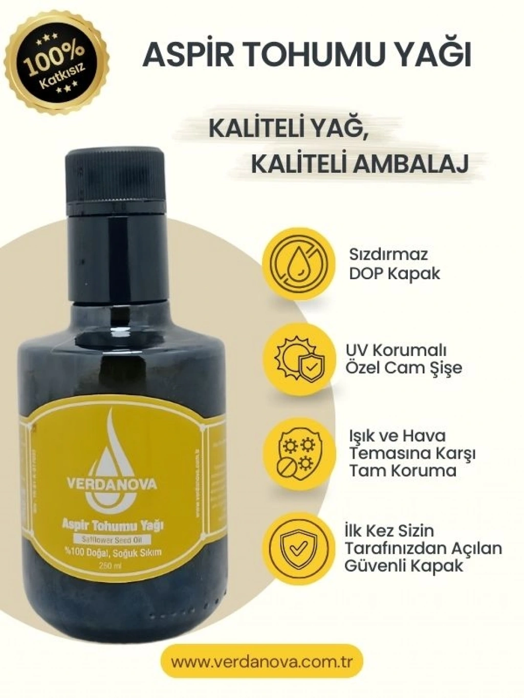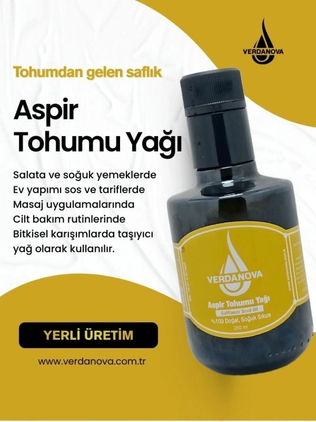 VerdaNova %100 Soğuk Sıkım Aspir Yağı, aspir tohumlarının düşük ısıda mekanik sıkım yöntemiyle elde edilen saf bir bitkisel yağdır. Ürün, katkı maddesi eklenmeden üretilmiş olup rafine edilmemiştir.