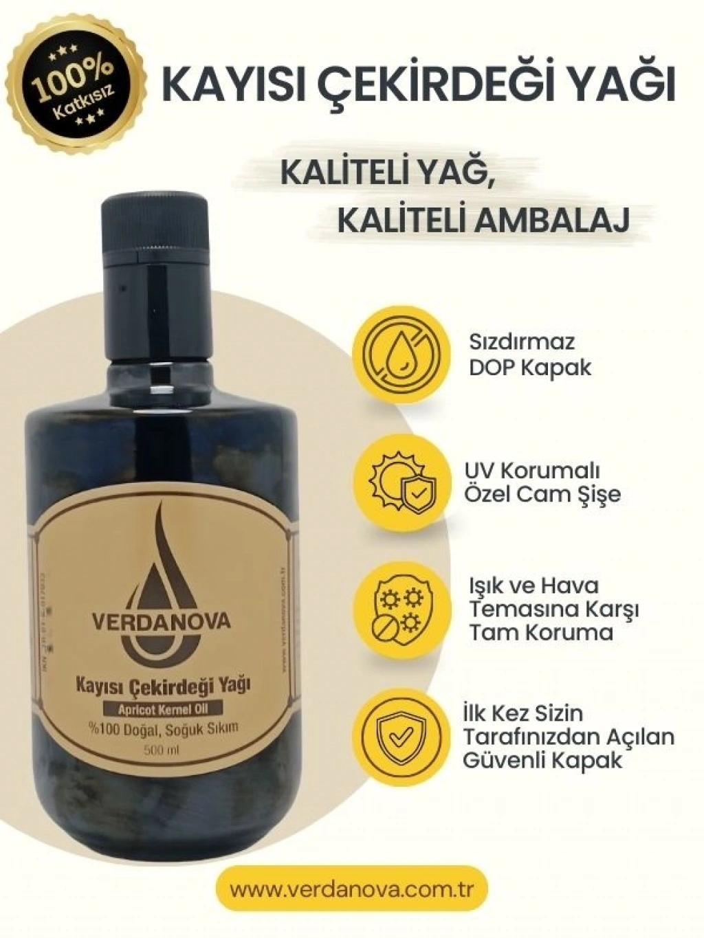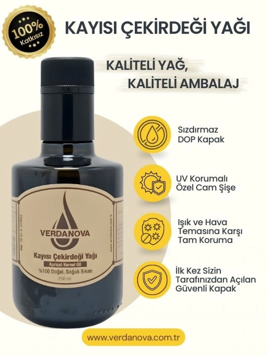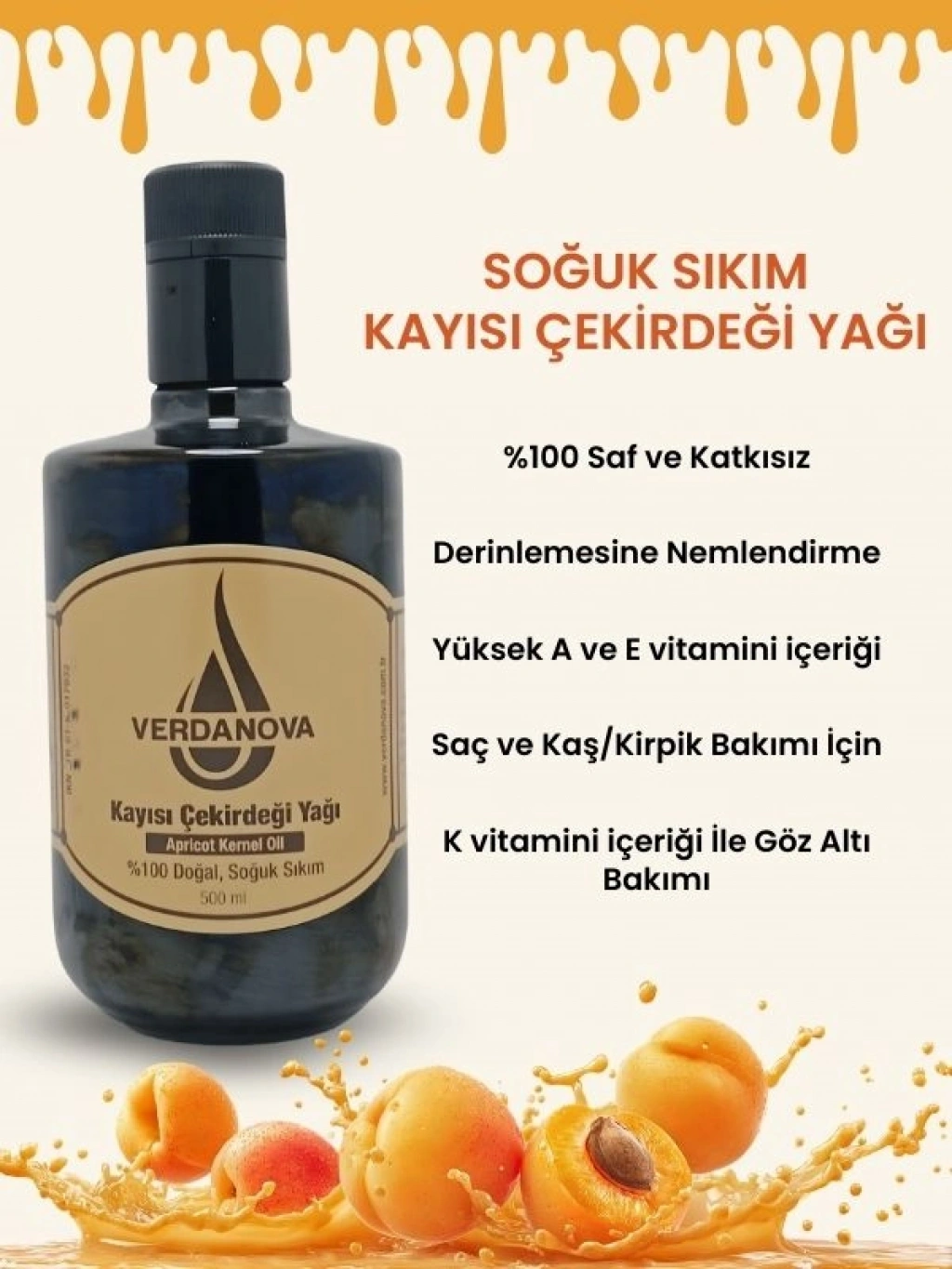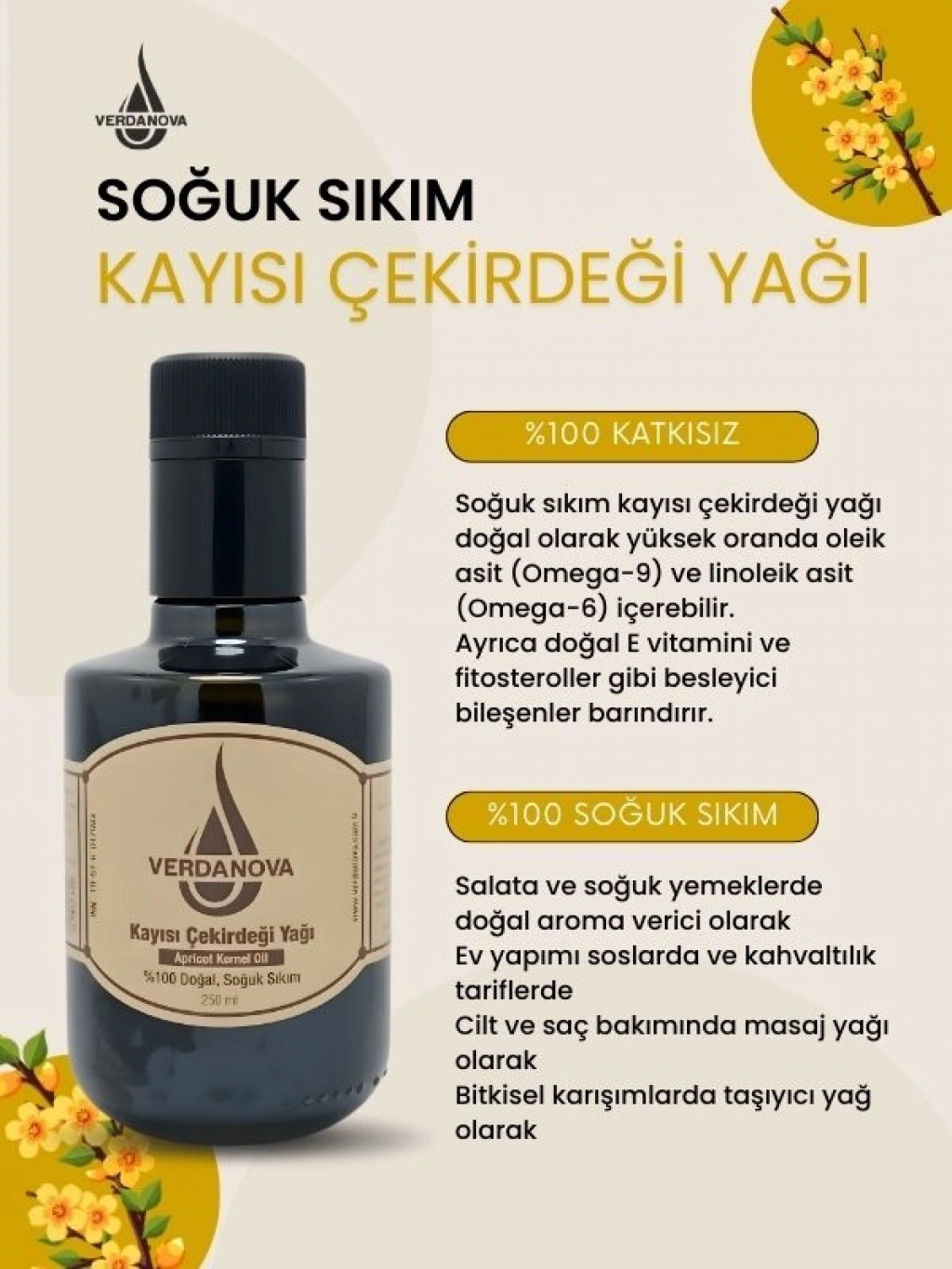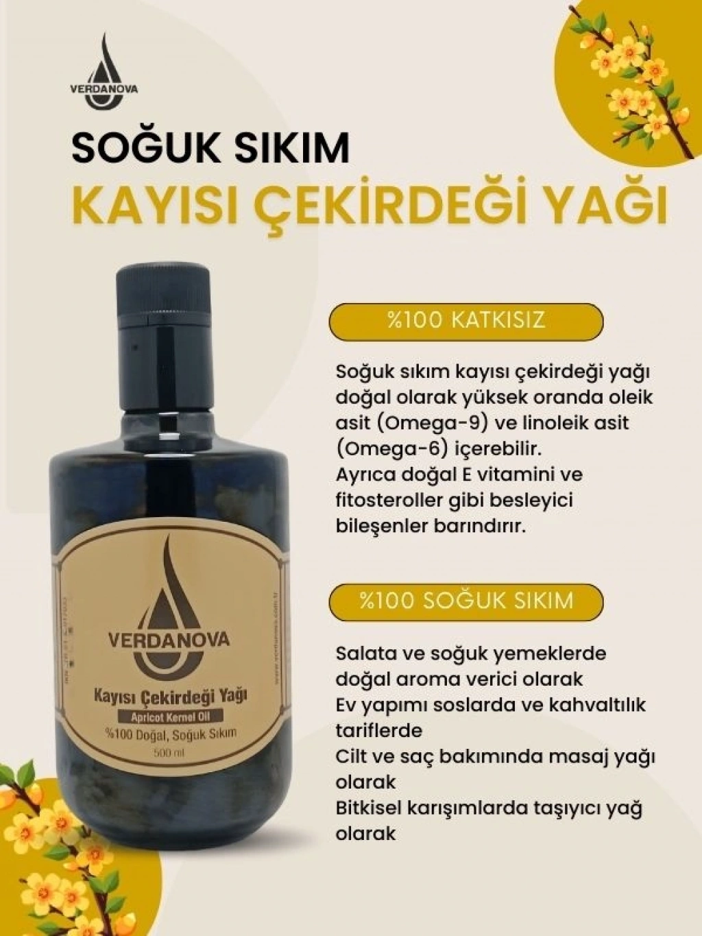 VerdaNova %100 Soğuk Sıkım Kayısı Çekirdeği Yağı, kayısı çekirdeklerinin düşük ısıda mekanik sıkım yöntemiyle elde edilen saf bir bitkisel yağdır. Ürün, katkı maddesi eklenmeden üretilmiş olup rafine edilmemiştir.